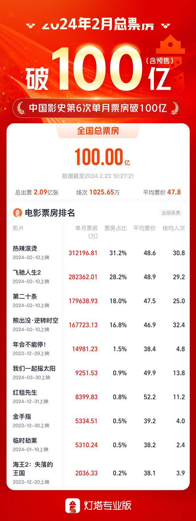 1905电影网讯据灯塔专业版数据显示,截至2月23日10时27分,中国电影2024年2月总票房(含预售)突破100亿元,总出票2.09亿张,场次达1025.65万,这也是中国影史第六次单月票房破100亿大关。
