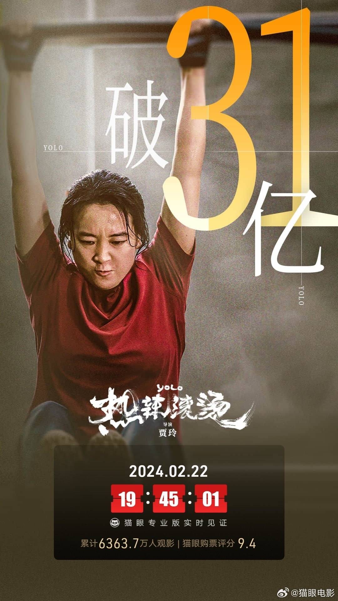 搜狐娱乐讯 据猫眼专业版数据,截至2月22日19:45,贾玲自导自演春节档电影《热辣滚烫》上映第13天 ,总票房破31亿,累计观影人次6363.7万。暂居2024年度内地票房总榜第一。