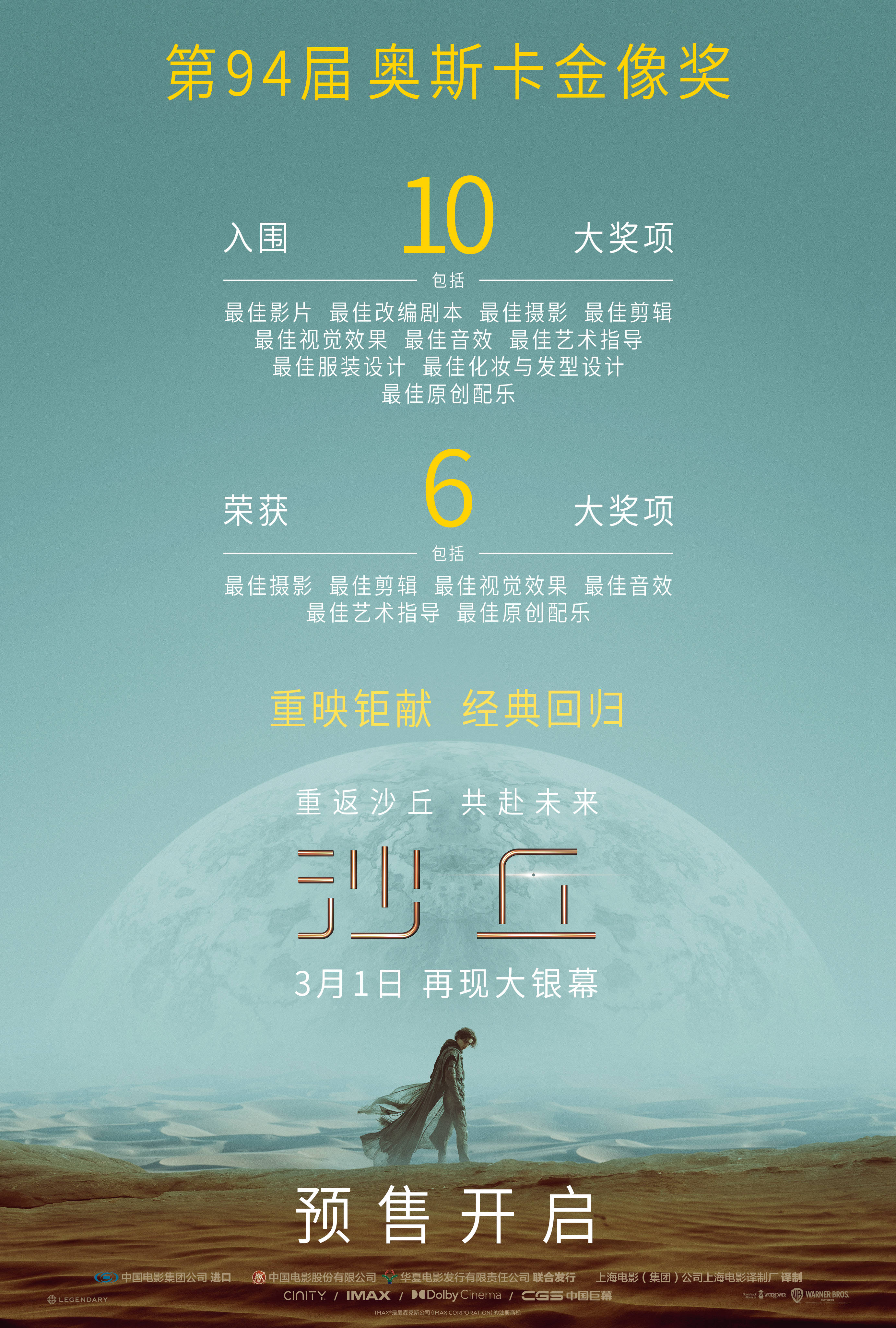 此番《沙丘》第一部3月1日重映、《沙丘2》3月8日全国上映,两部连映为内地观众构建起了一个完整的沙丘世界。故事中各方势力关系和人物间的恩怨情仇,将更全面地呈现,让观众们真正地走进沙丘世界。这不仅满足第一部老粉们影院串联重刷的夙愿,也赋予新粉们从头见证“天选之子”保罗主宰命运之旅起点的机会,构建观赏《沙丘》系列的最完整体验。好莱坞科幻巨制《沙丘》第一部由美国传奇影业和美国华纳兄弟影片公司携手打造,影片将于3月1日在内地大银幕重映,今日预售已开启!且《沙丘2》将于3月8日内地公映。