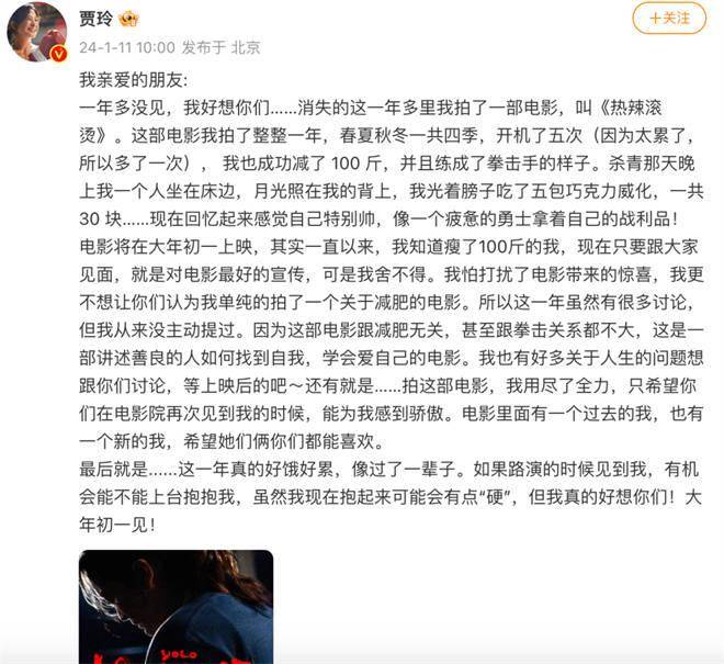 或许是相声演员出身的缘故,贾玲非常懂得观众的心理情绪。果然在《热辣滚烫》首次官宣时,贾玲长文中的一句,“我减了100斤”,很快成为了外界关注的核心焦点。