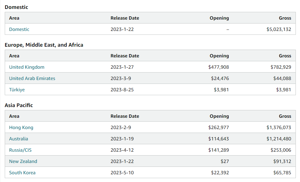 从boxoffice来看,《流浪地球2》在美国本土、欧洲(英国、土耳其等)以及亚洲(香港、澳大利亚)等地均有上映,其中美国票房拿到500多万美金,已经算不错的成绩。