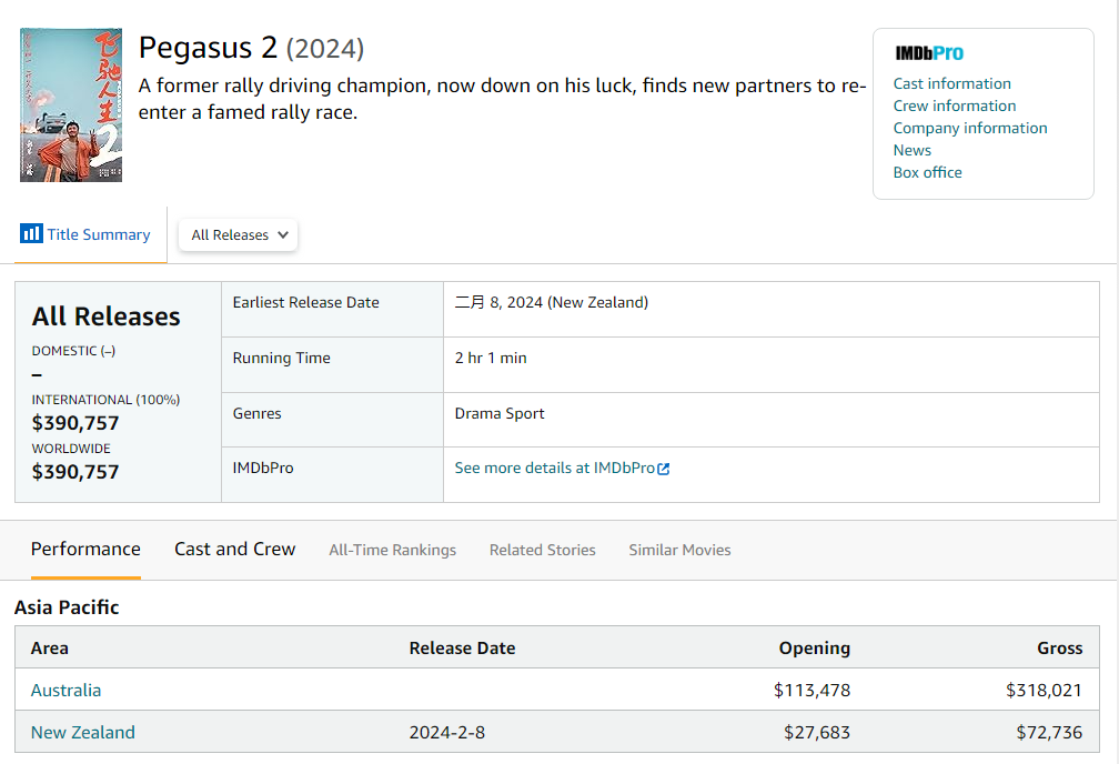 来看下《飞驰人生2》海外票房表现,和其他电影的海外发行路径不同,《飞驰人生2》海外上映甚至要比国内早两天,从2月8日就登陆了新西兰。但一共也只在新西兰和澳大利亚两个国家上映,并没有登陆欧洲以及票仓国家美国和英国等。