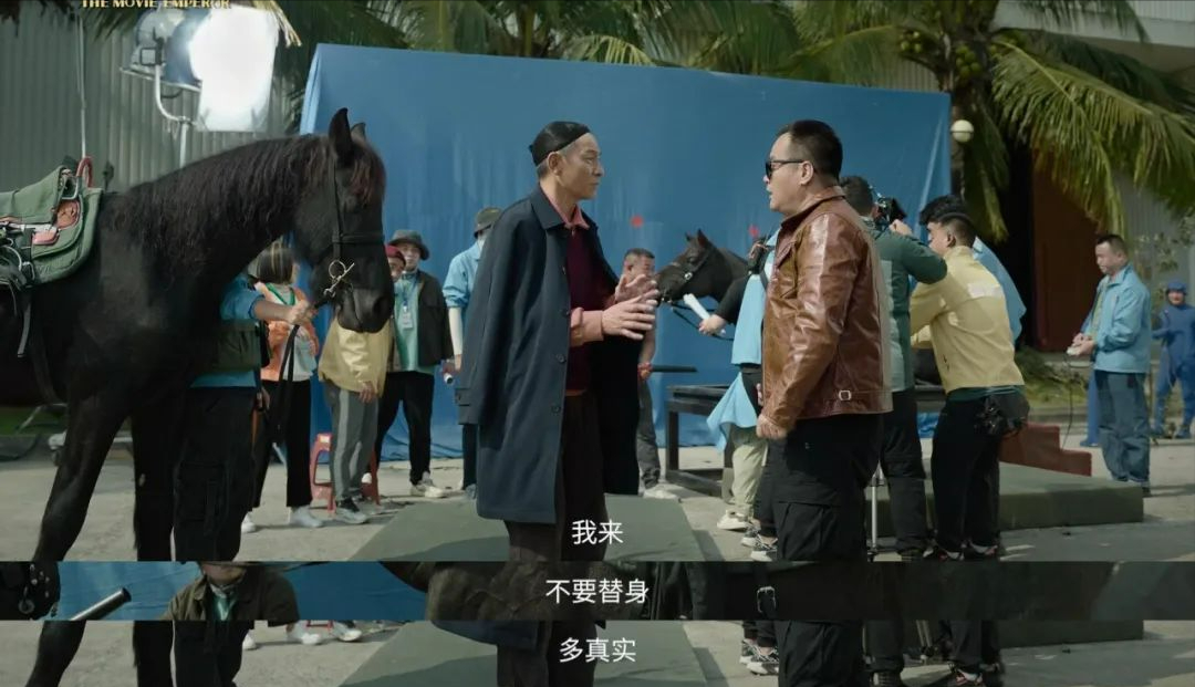 片中有一段情节,是说刘伟驰为了让电影呈现出更显真实的效果,在拍摄一个从马背上摔下来的危险镜头时,他拒绝使用替身,坚持要亲自完成镜头。