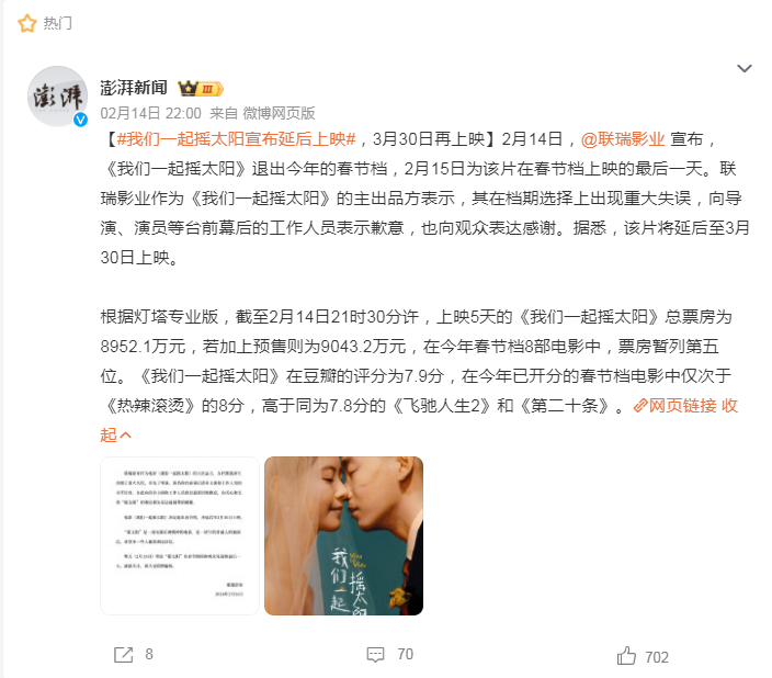 2月14日,票房9000多万,比《红毯先生》还略高的《我们一起摇太阳》已经宣布撤档,出品方在公告上说“在档期选择上出现了重大失误”,不玩了。