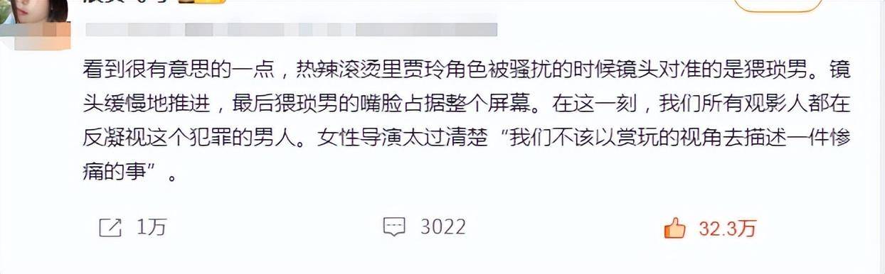 贾玲和张艺谋同样是拍性骚扰片段,前者处理妥当,没有一处毛病可以挑,而后者满满的男凝,让女性观众看了浑身不适。
