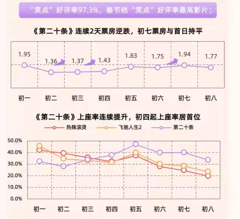 《第二十条》因为题材的原因在下沉市场的观众印象中会更加严肃一些,所以在春节档前期比较吃亏,但随着口碑扩散,“自来水”也越来越多,影片凭借较高的口碑和笑点率,票房连连逆跌,后期开始持续发力。