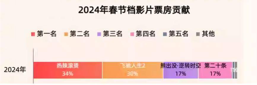 另外一方面,今年票房前四名的影片它们加起来的票房份额占到了大盘的97%,其他影片的生存处境相当艰难,以前的春节档头部影片“吃肉”,其它影片还可以“喝汤”,但今年情况更像是赢家通吃的局面。