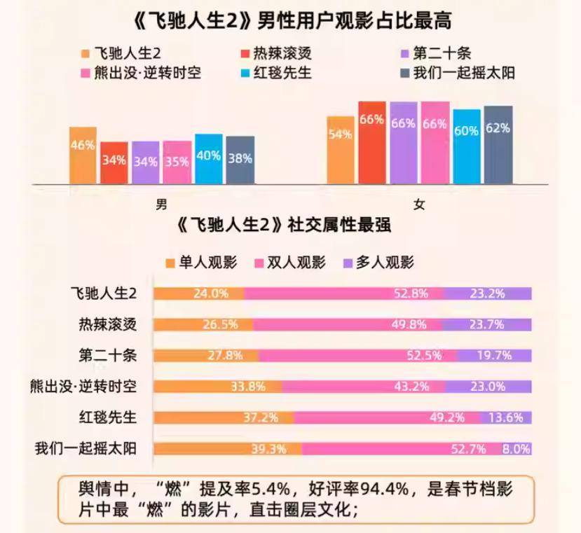 从单片数据来看,《飞驰人生2》以4.23亿元的成绩拿下首日票房冠军,同时影片也是同档期影片中男性占比最高的影片,是社交属性同档期最强,春节档最“燃”的影片。