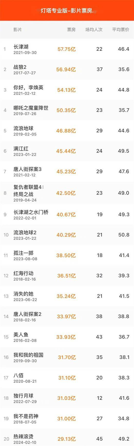 1905电影网讯2月19日,据灯塔专业版数据显示,春节档电影上映至第10天,票房超29.13亿,超过,进入中国影史票房榜前20名。与等差距较小,影片持续上映中,票房还将进一步增长。此外,由执导的位列中国电影票房总榜第三。