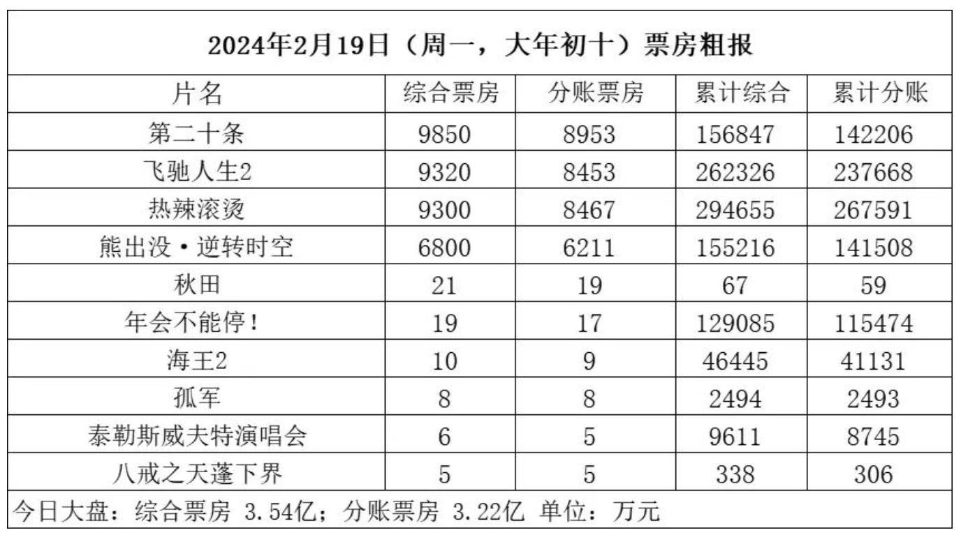 2月19日周一(大年初十),全国共排映41.9万场,观影人次约786万,根据初步统计产出票房3.54亿。