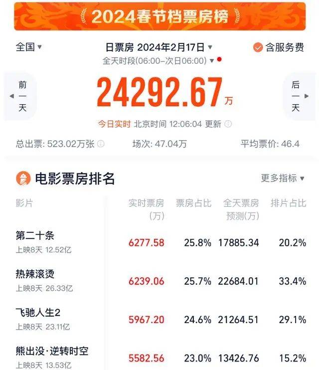 春节档之后,四部影片仍将继续争锋,灯塔专业版预测《第二十条》总票房将达到24亿元,或能反超《熊出没·逆转时空》。但二者的较量,无法撼动前两名《热辣滚烫》《飞驰人生2》。