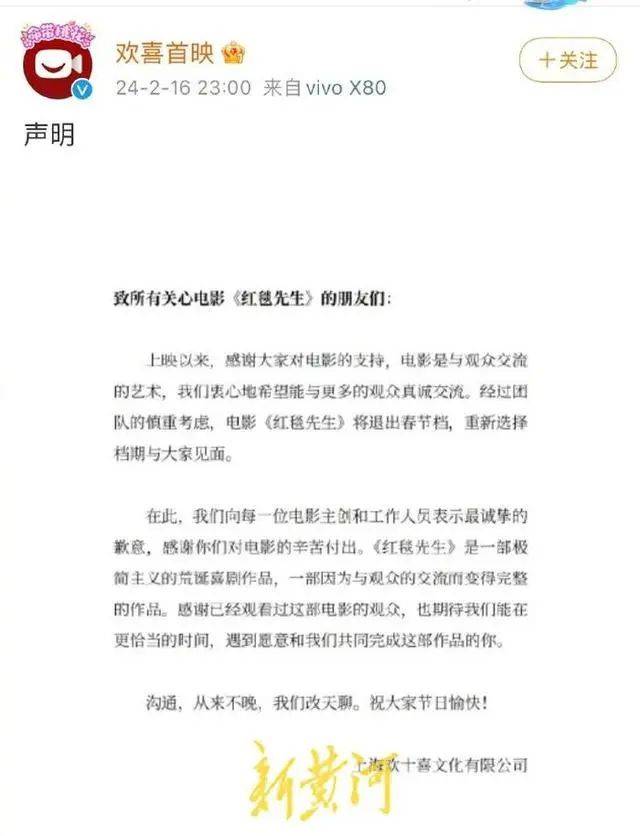 2月16日23:00,目前在映的《红毯先生》通过出品方@欢喜首映发布声明,宣布将退出春节档,重新选择档期与观众见面。