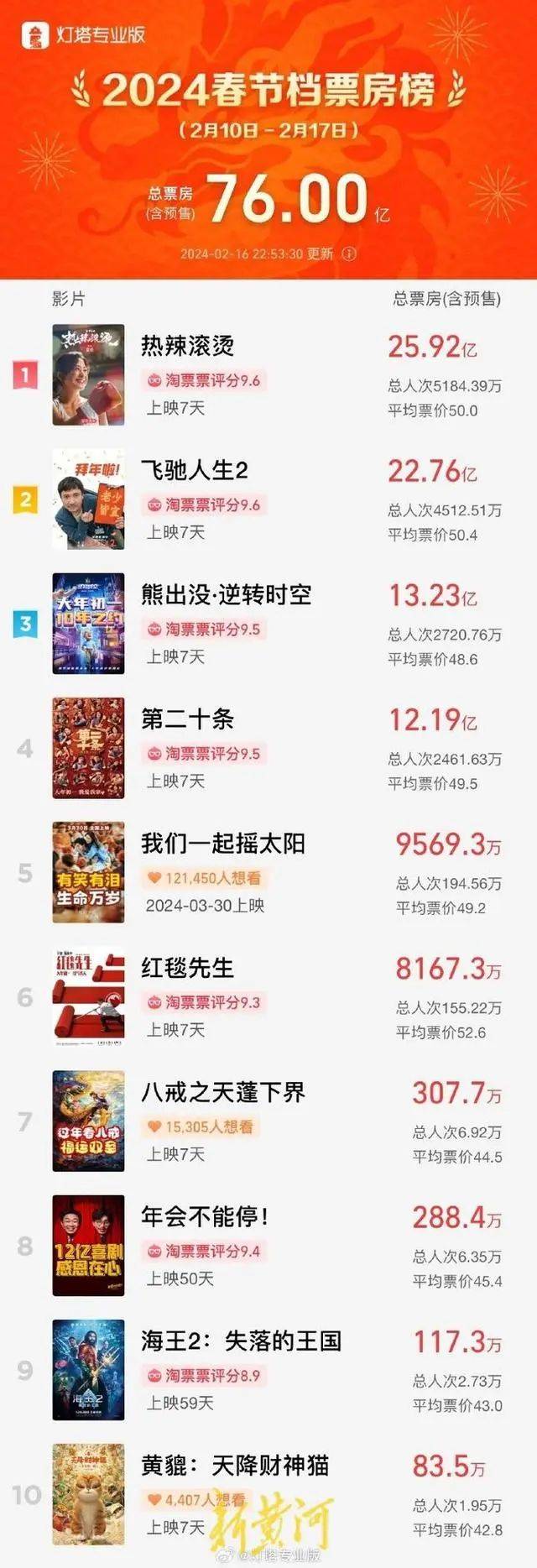 据灯塔专业版数据,截至2月16日22时53分,2024年春节档(2月10日—2月17日)档期总票房(含预售)已突破76亿。《热辣滚烫》《飞驰人生2》《熊出没·逆转时空》继续领跑,暂列档期票房前三位。