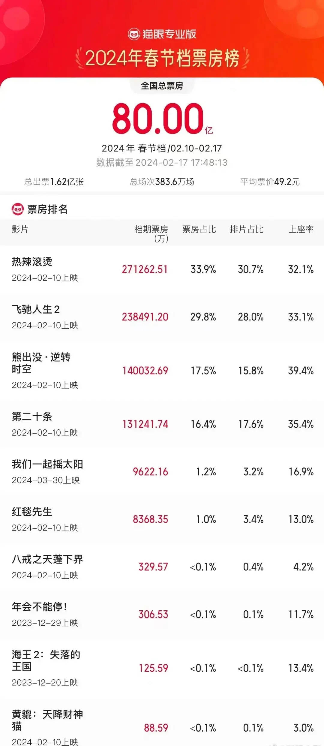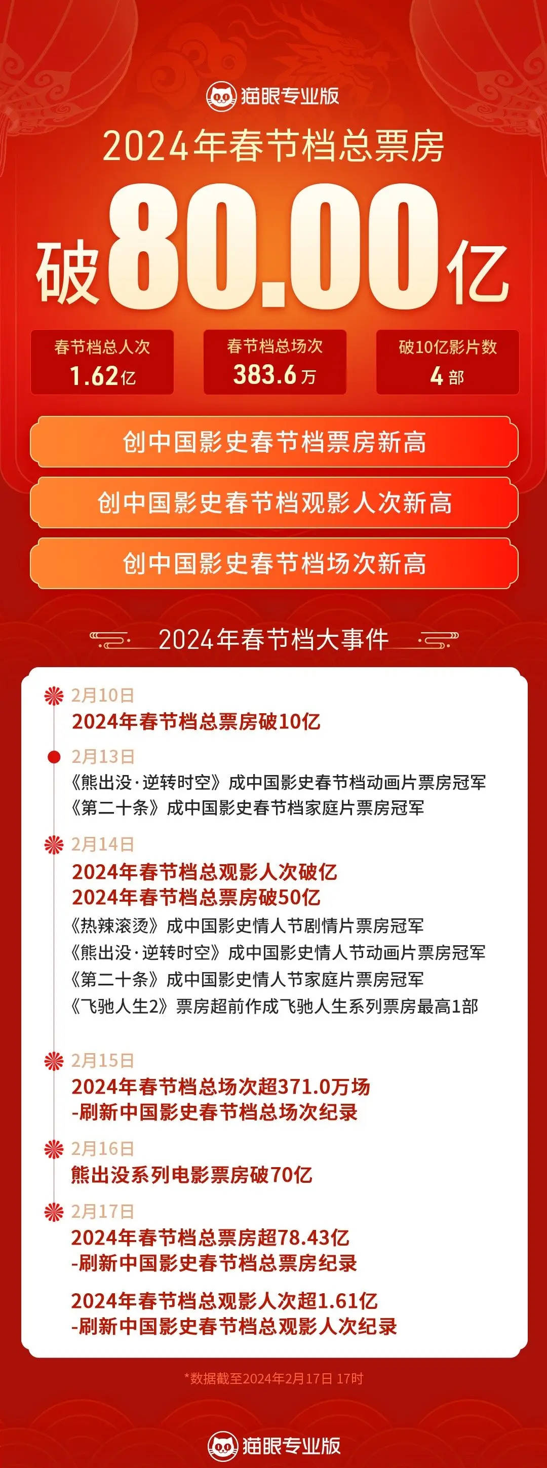 据猫眼专业版数据,截至2月17日17时,2024春节档总票房破80亿,总人次1.62亿,总场次383.6万,全面刷新春节档影史纪录!
