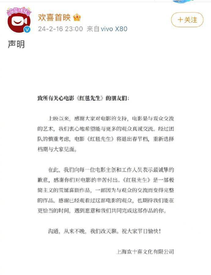 《红毯先生》的声明对观众表达了感谢,对主创及工作人员表示了歉意,表示“《红毯先生》是一部极简主义的荒诞喜剧作品,一部因为与观众的交流而变得完整的作品。感谢已经观看过这部电影的观众,也期待我们能在更恰当的时间,遇到愿意和我们共同完成这部作品的你。沟通,从来不晚,我们改天聊。”