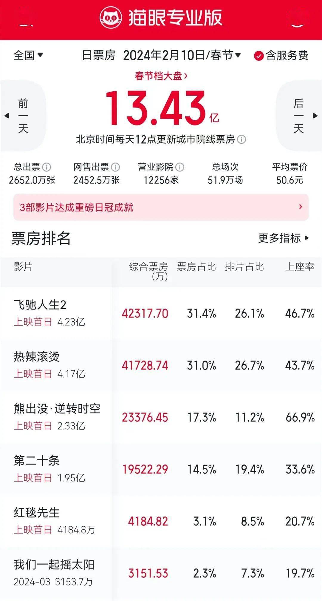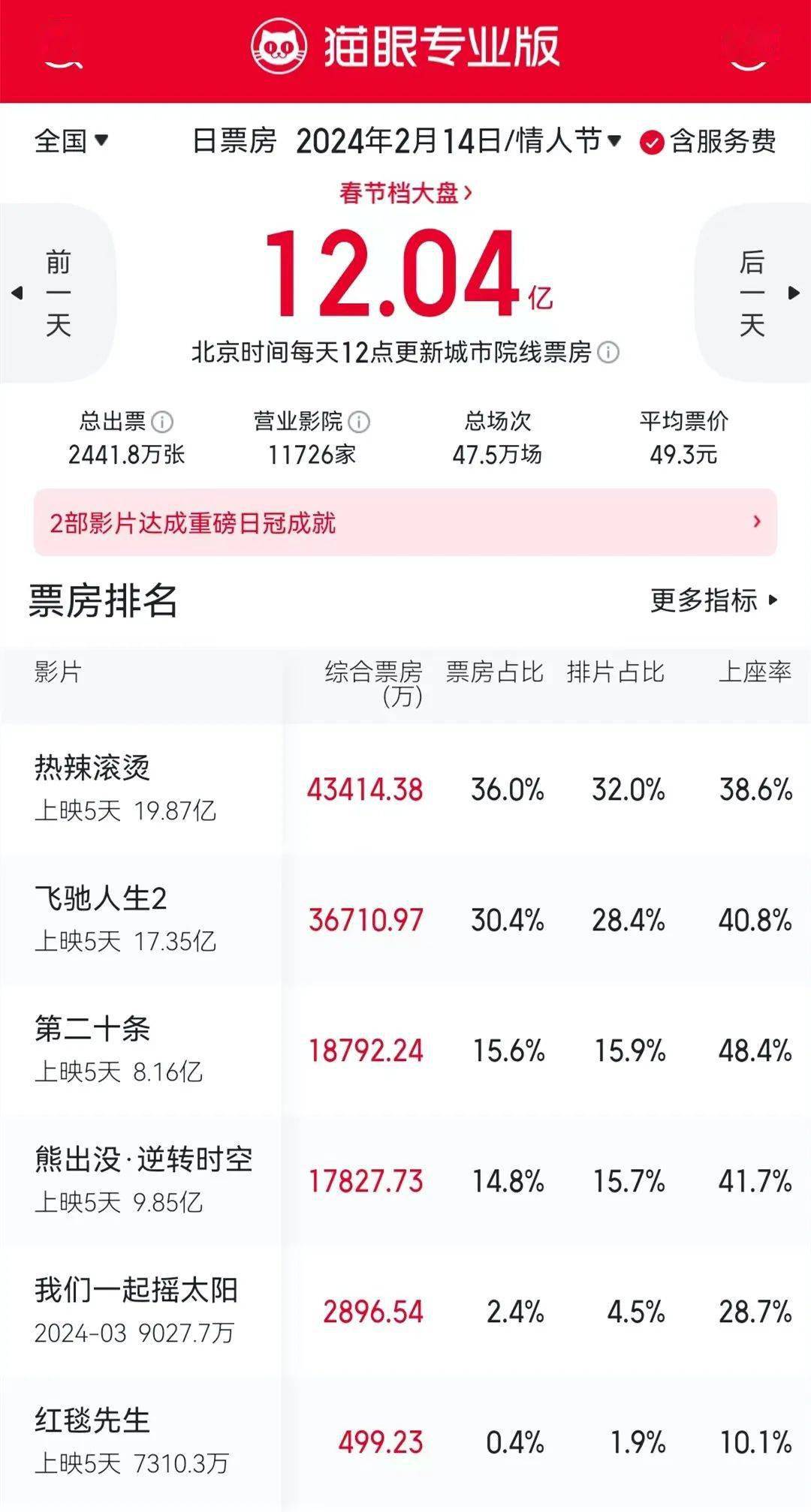 今年春节档还覆盖了情人节。2月14日(初五),全国票房逆跌至12.04亿,只低于2021年的14.72亿(当年情人节为大年初三),成为情人节单日票房历史第二。