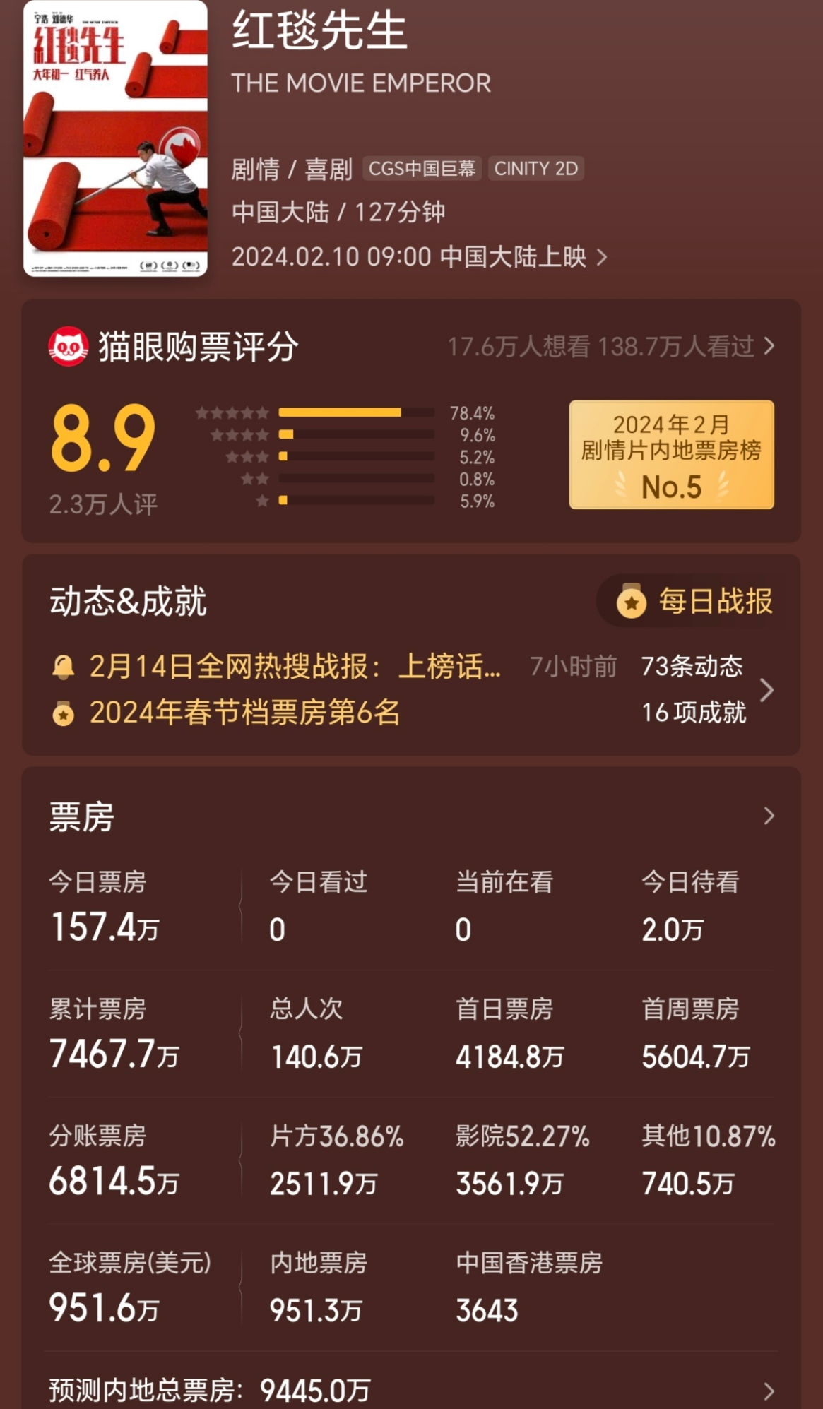 搜狐娱乐讯 (哈麦/文)宁浩、刘德华的《红毯先生》成了今年春节档热门电影中最惨的一部,上映五天票房7310万元,排片跌到了1.9%,日票房500万元,上座率10.1%,远远垫底。