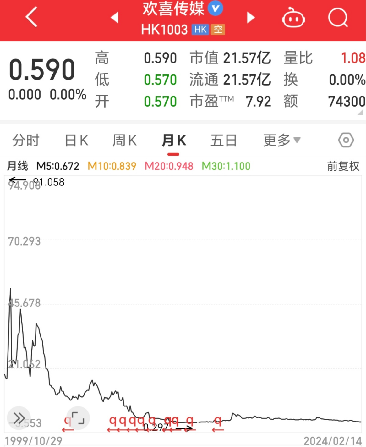 欢喜传媒目前港股市值已缩水至不到22亿港元,股价屡创新低。