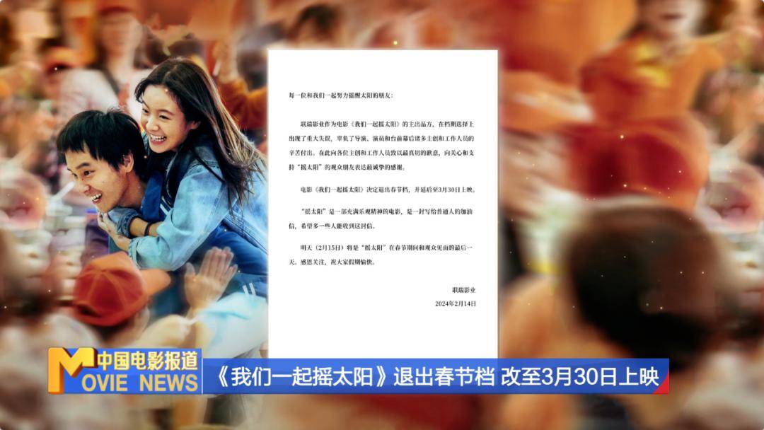 2月14日晚,联瑞影业宣布因档期选择出现重大失误,其主投的电影《我们一起摇太阳》退出竞争激烈的春节档,延后至今年3月30日上映,2月15日是该片在春节期间和观众见面的最后一天。