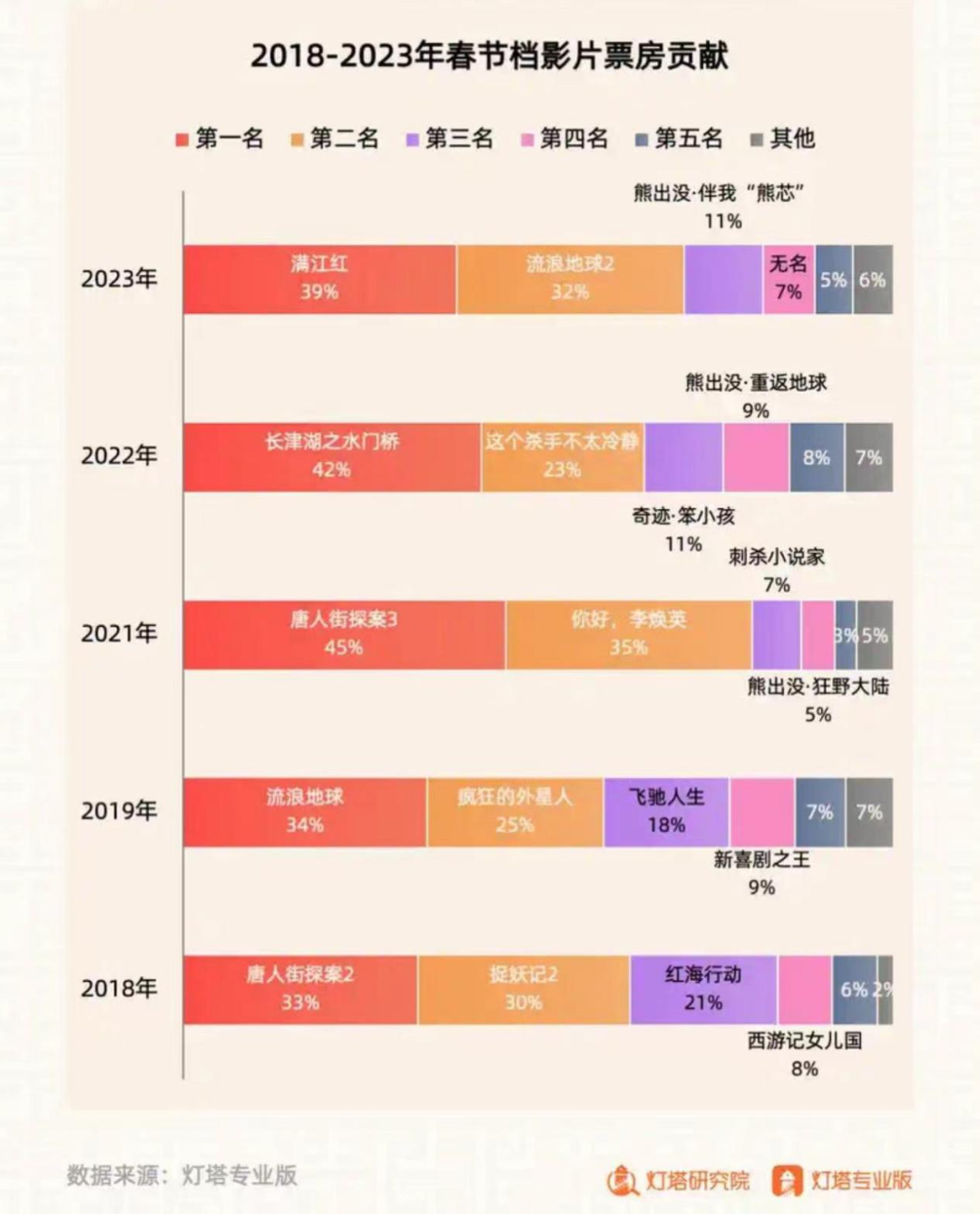其次,过去五届春节档已经证明了整个档期越来越向头部倾斜。过去五届春节档,票房前三名平均票房占比是81.2%。一旦影片挤不进票房前三名,基本失去了翻盘希望。