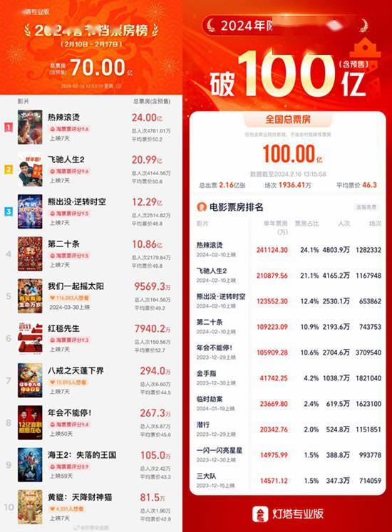 原标题:2024春节档破70亿成影史第二 年度票房破百亿!