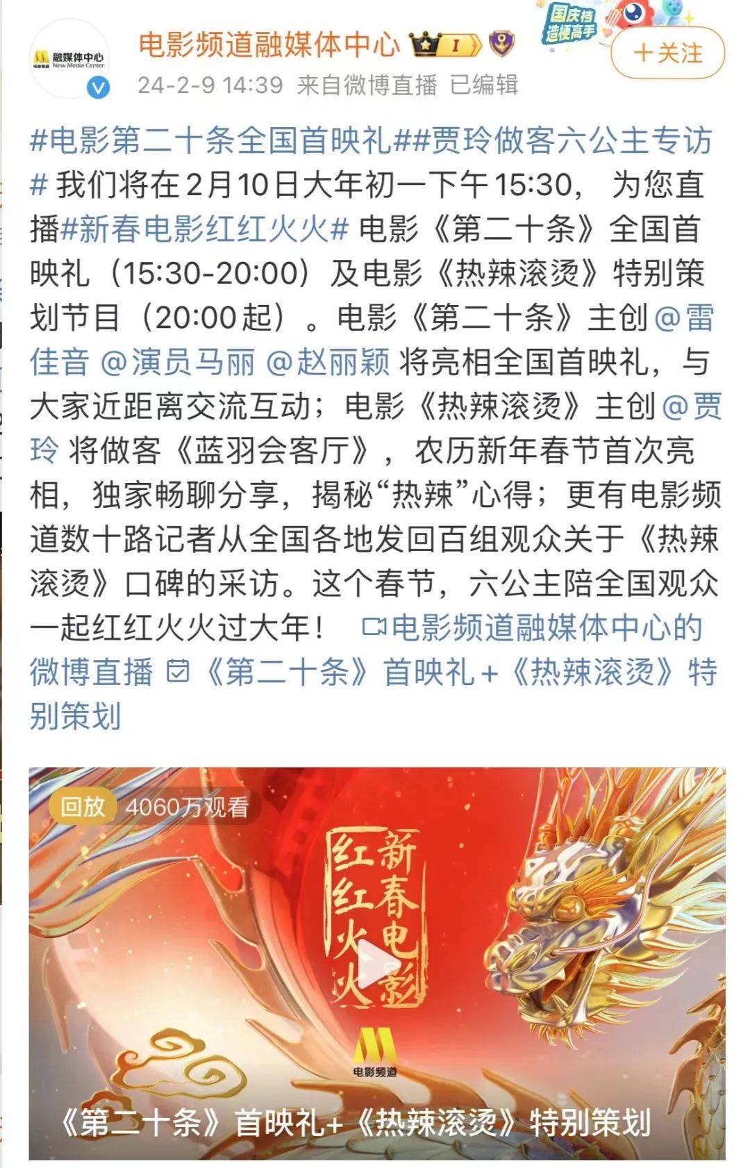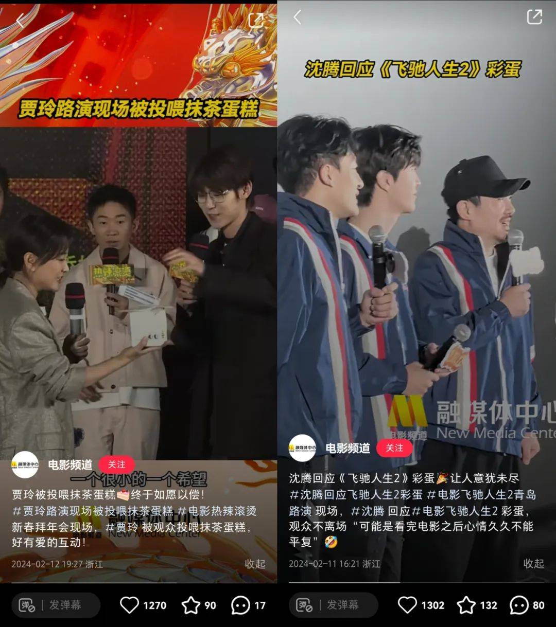 新媒体侧,电影频道呈现清晰的微博做话题、抖音做内容思路。据悉,截至当下,电影频道推出的春节档策划覆盖了上百家媒体,全网观看量超4亿次,其中,电影宣传融媒体短视频超过1000条,播放量超11亿次。为春节档影片打造的全网热搜话题达到105个,相关话题阅读量达到40亿 。同时,电影频道也尝试在快手、小红书、B站等平台构筑更多元的宣推阵地。