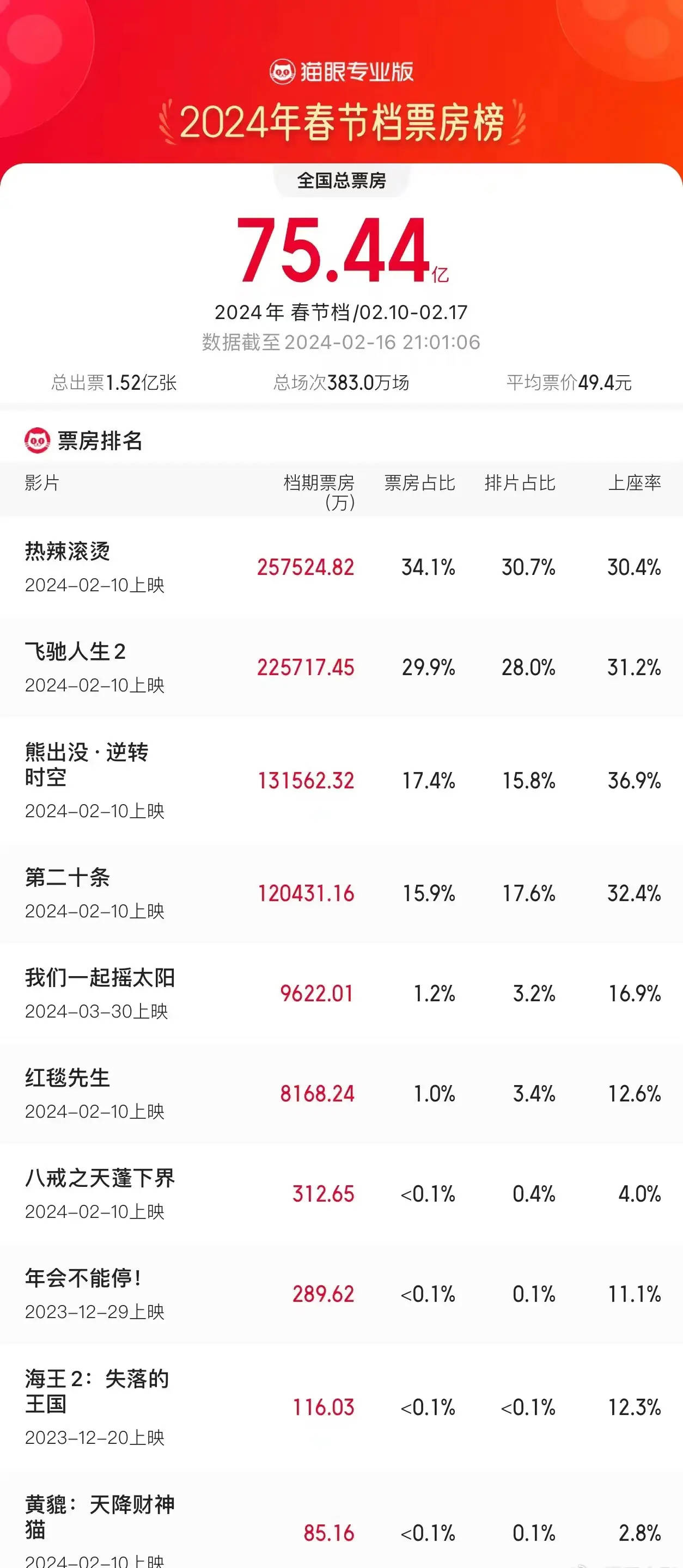 原标题:2024春节档总票房突破75亿!观影人次高达1.52亿