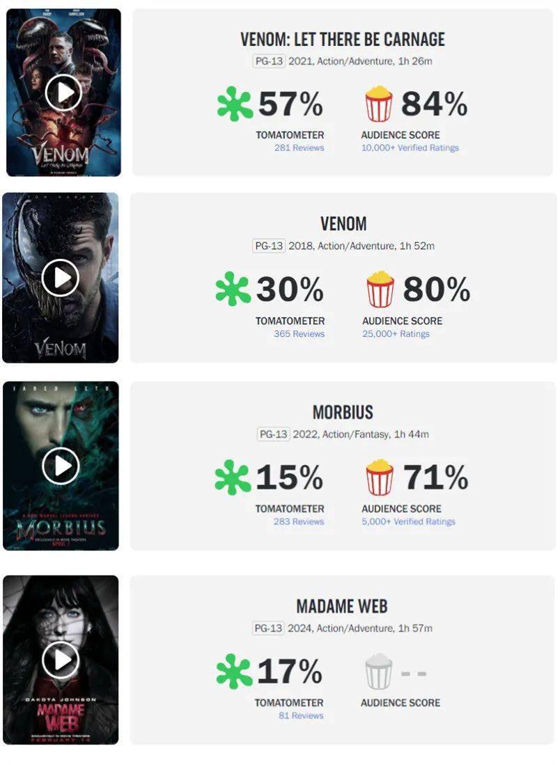 另外值得一提的,洛伦佐出品的《蜘蛛夫人》扑街了,就像预想中那样,烂番茄现在17%,基本跟《莫比亚斯》同一个级别,索尼的蜘蛛侠电影宇宙的电影,基本上影评人口碑全部烂完了,不过观众口碑都还不错,是那种大家喜欢看看热闹的典型烂片。