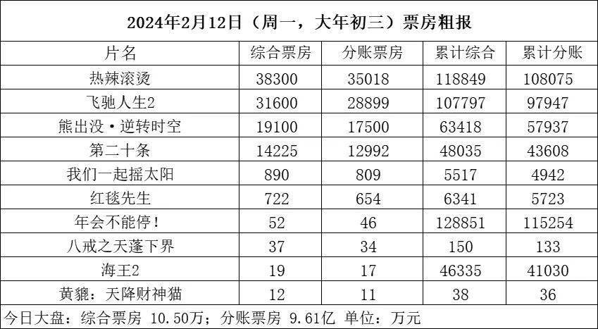 2月12日(大年初三),全国共排映48.5万场,观影人次约2075万,根据初步统计产出票房10.50亿,落后去年同期。