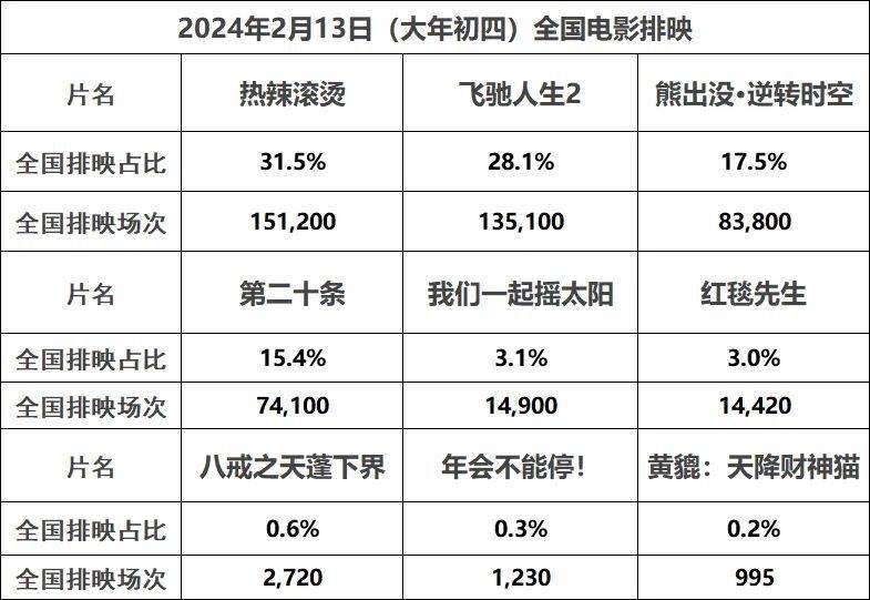 大年初四市场排映情况更新:《热辣滚烫》单日排映占比升至31.5%,扩大了对亚军的领先优势。《飞驰人生2》单日排映占比也小涨至28.1%,继续创开画以来新高。动画续集《熊出没·逆转时空》单日占比小跌至17.5%,而《第二十条》占比维持在15%出头%。《红毯先生》《我们一起摇太阳》占比均已跌至3%。