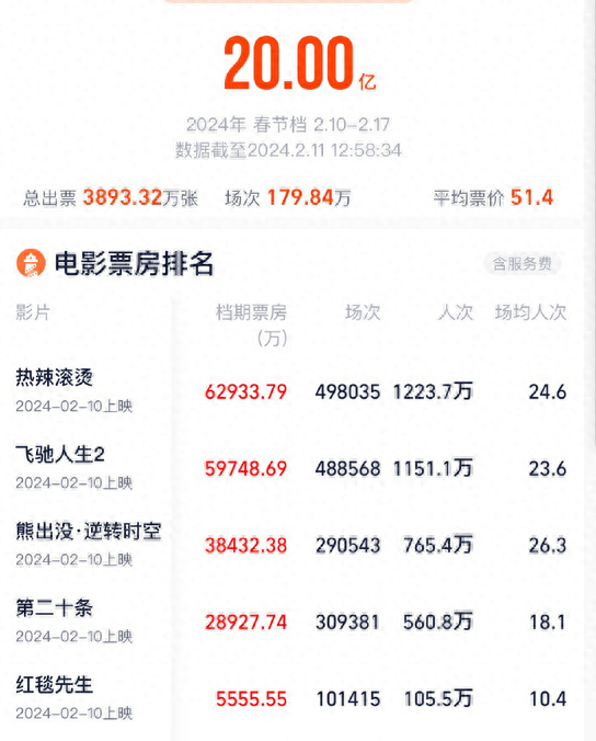 这个春节档有点怪,截至2月11日12时58分,2024年春节档(2月10日—2月17日)档期总票房(含预售)突破20亿!《热辣滚烫》《飞驰人生2》《熊出没·逆转时空》暂列档期票房前三位。 大导演张艺谋的力作《第二十条》,票房居然还没《熊出没》高,更不用说跟非专业导演出身的贾玲和韩寒相比。