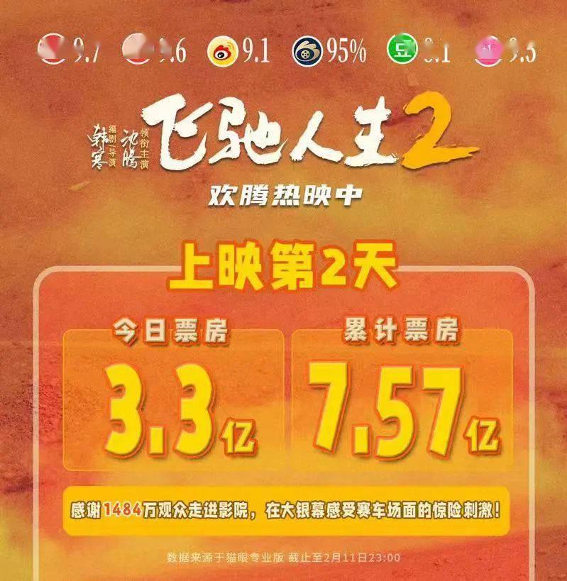 2月11日《飞驰人生2》单日票房3.33亿,截至2月11日晚,《飞驰人生2》共斩获7.6亿票房,位列2024春节档票房榜亚军,以26.5%的排片占比,拿下30.3%的票房。