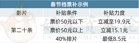 一发行人员告诉娱乐资本论,一般春节档头部影片的宣发预算在2亿左右,其中发行费用占大头,一部分是票补,另外一笔是公关费,也就是排片费再加上人员的差旅等。“今年出台了政策,严厉打击排片费。原来2亿的占比中,可能每家要拿出来5000至8000万去做公关,今年这个费用流向了票补,所以票补力度明显变大。除此之外,之前的票补限制被解除,所以会出现低于19.9元的票价。”