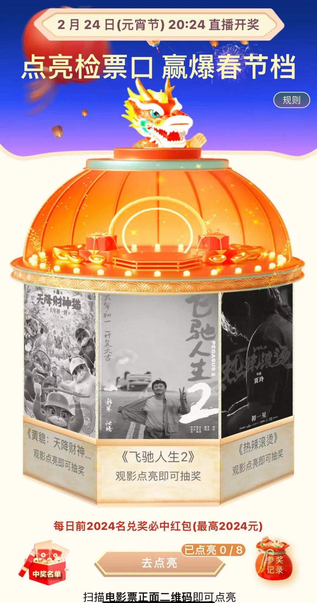 简票集团在近期推出的“点亮检票口”活动就成为一种创新的观影互动形式。春节档期间,观众可以登录“简票影宝”小程序,扫描春节档电影票的二维码即可“点亮”影片参与抽奖,每日前2024名观众必中红包,还可以参与后续抽新能源汽车的活动。