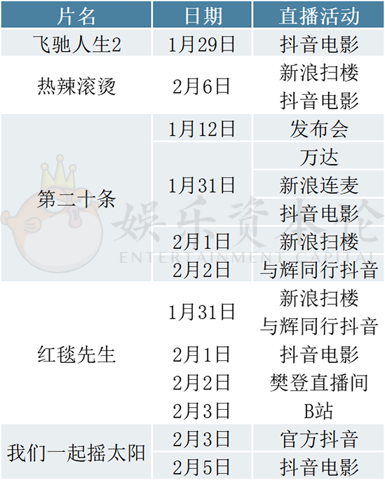 而今年春节档各大片方进抖音官方直播间和新浪扫楼成为标配。最明显是《红毯先生》,1月31日一天之内连续进入新浪扫楼和董宇辉直播间,之后连续三日走进抖音电影、B站、樊登的直播间。