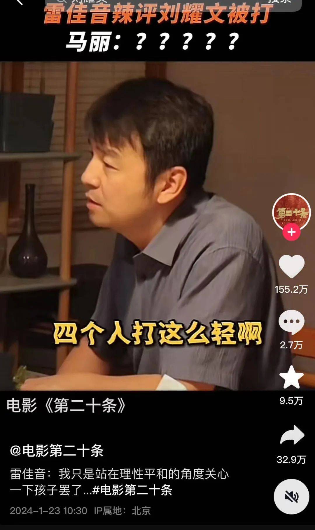 《第二十条》是现实主义题材,讲述”正当防卫”的条款,一则“信息量很大”的预告中明显出现暴力冲突片段,但营销关键词是“合家欢”,短视频往“我爱我家”的温情向剪辑,早期释放出的短视频中,雷佳音和马丽饰演夫妻的吵架又和好的温情片段,配上“你的父母也这样吗?”等话题,想打中最普遍的家庭情感因素。