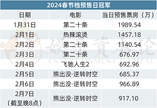 但票补停止后,预售票房后劲不足也让春节档搭大盘格局稍显疲态。去年两部头部影片《满江红》和《流浪地球2》上映前一周每天都能拉动1000万以上预售票房,而今年三部第一梯队影片在2月4日至2月6日预售增速明显下滑,均不到700万。同时,一直没有票补的《熊出没》反而展现出强劲的“硬通货”实力,连续夺得预售日冠军。