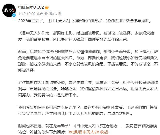 片方发文称:“武侠电影作为中国独有类型,曾经走向世界,享有无上荣光,时至今日却呈现创作凋零、市场鲜见的景象......我们要做的,是先活下来。我们希望能保护我们来之不易的小IP,使它能有机会继续发展,于是我们暂且将船停靠安全港湾,决定回到《目中无人》开始的地方,与您再次相见。”