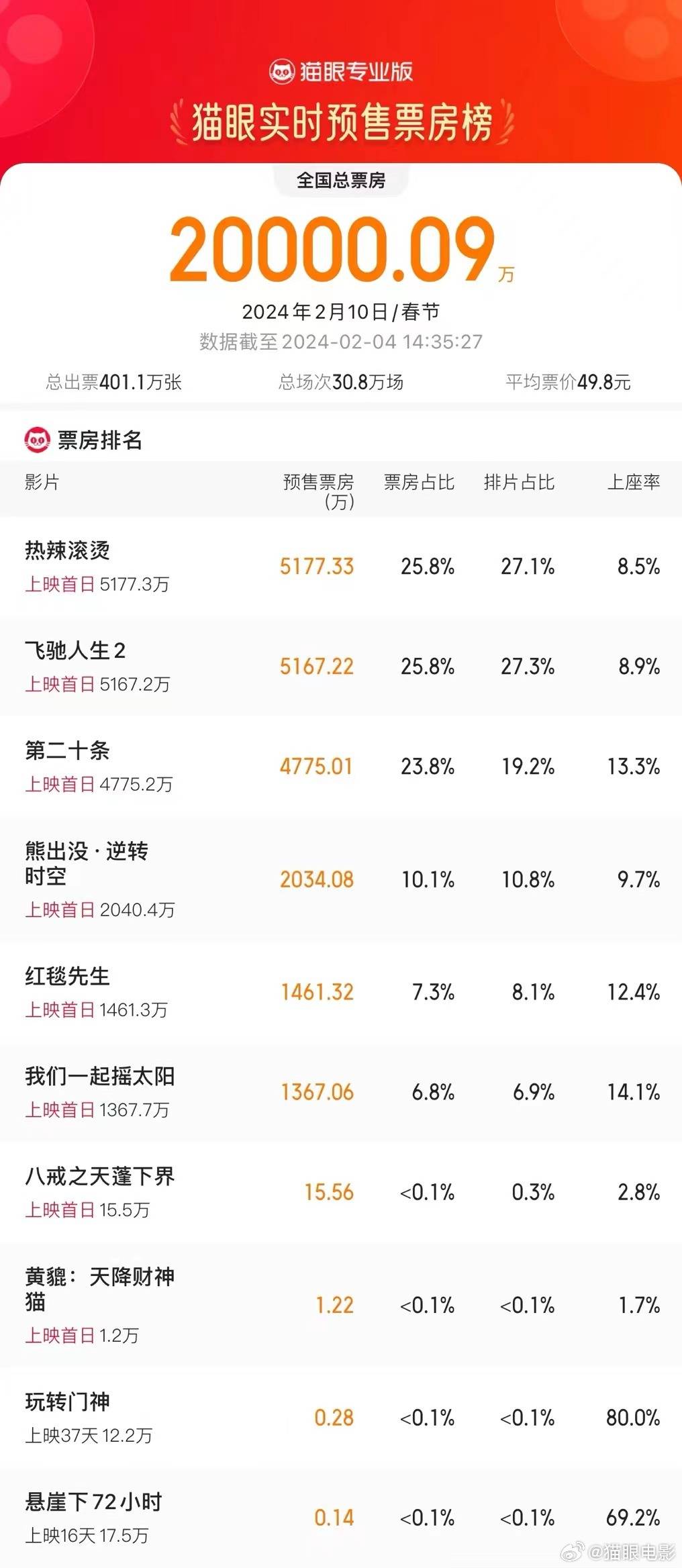 原标题:2024大年初一预售票房破2亿 《热辣滚烫》《飞驰人生2》《第二十条》分列前三