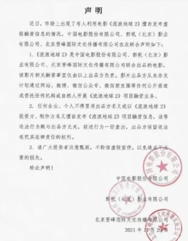 早在2021年《流浪地球2》热拍时,就曾有人在微博、朋友圈等渠道发布虚假融资信息。几大出品方也迅速发布联合声明:从未委托任何机构或自然人开展项目融资业务。
