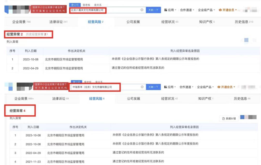 截止发稿时间,1905电影网通过某企业信息查询工具发现,“8·17”影视投资诈骗案4家公司均存在2-4次不等的经营异常记录。其中,北京八毫米文化传媒有限公司存在多个限制消费令、失信被执行人(老赖)信息。