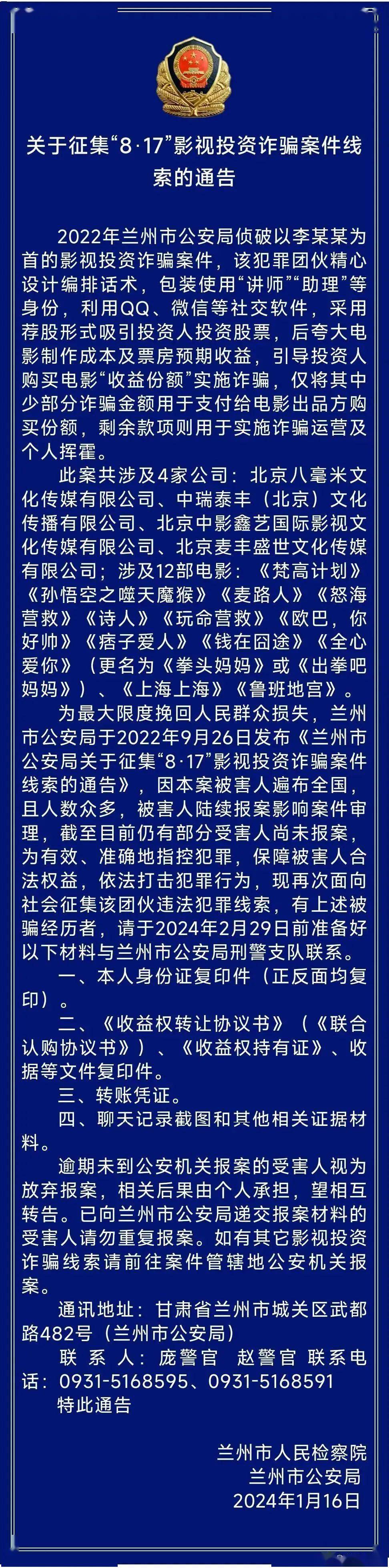 几乎同时,另一则“影视投资诈骗”相关消息也登上热搜:兰州市人民检察院、兰州市公安局联合发布通告,公开征集“8·17”影视投资诈骗案件线索。