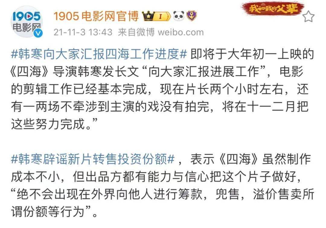 在《四海》上映前夕,导演韩寒也曾亲自发文对此类消息进行澄清:“我们《四海》,虽然制作成本不小,但我们几个稳定合作的出品方都有能力与信心把这个片子做好,盈亏自担,绝不会出现在外界向他人进行筹款,兜售,溢价售卖所谓份额等行为。”