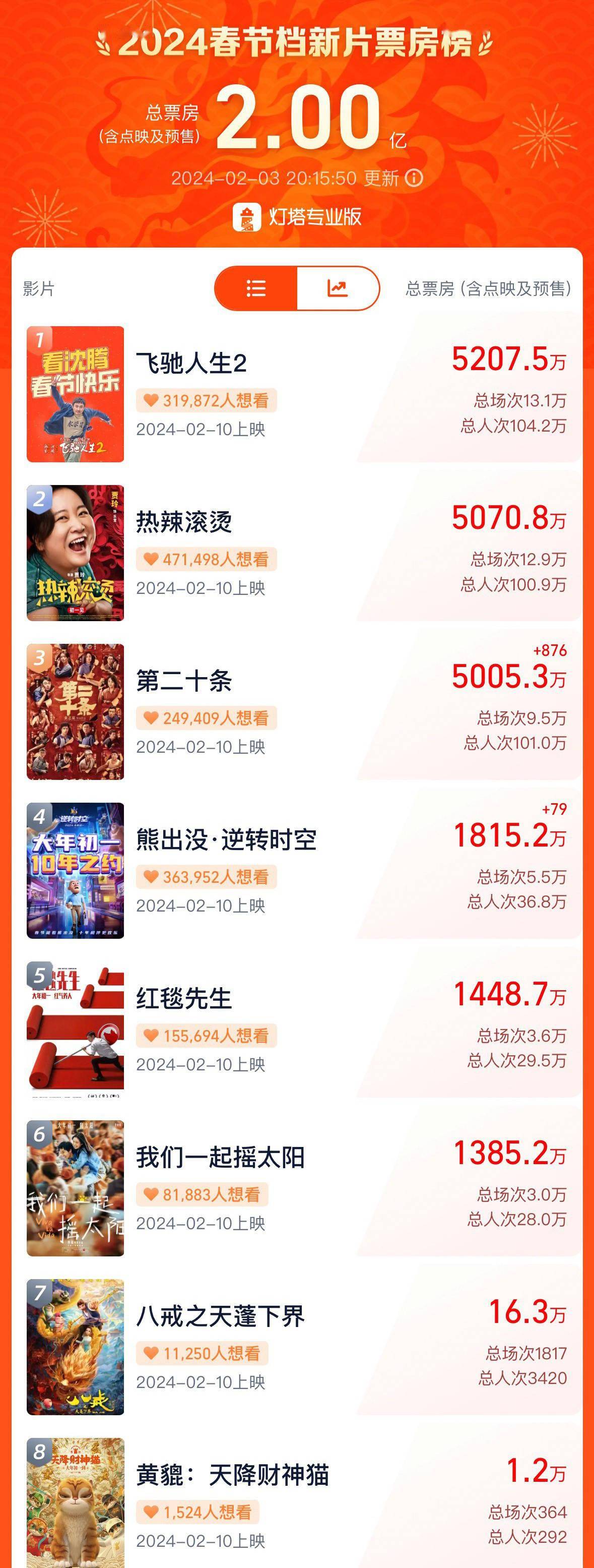原标题:2024春节档新片预售票房破2亿!三部影片超5000万
