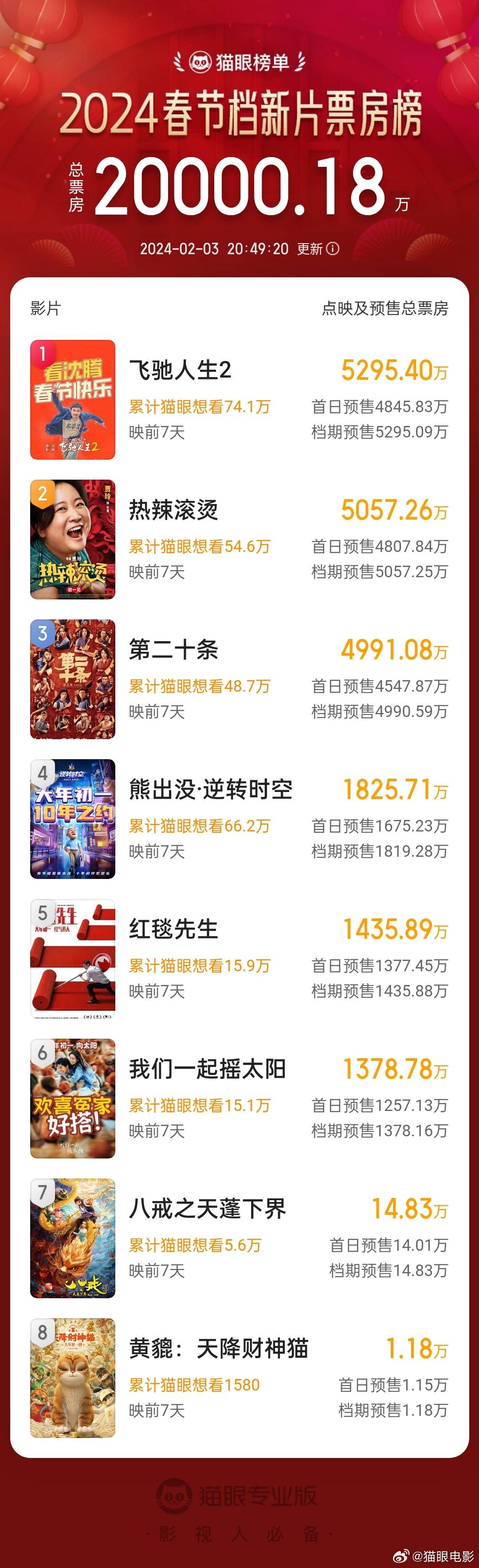 搜狐娱乐讯 据猫眼专业版数据,2024年2月3日20时49分,2024年春节档新片预售总票房破2亿!《飞驰人生2》《热辣滚烫》《第二十条》分列新片预售榜前三位。其中,《飞驰人生2》《热辣滚烫》均破5000千万。