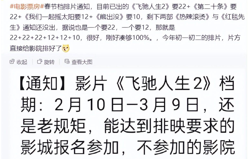 这种方式相当于无形中也在给电影院施压,按照这样的排片比例来看,《飞驰人生二》《热辣滚烫》等电影的排片占22%,而《我们一起摇太阳》占了12%,排片市场基本上被瓜分完毕了。