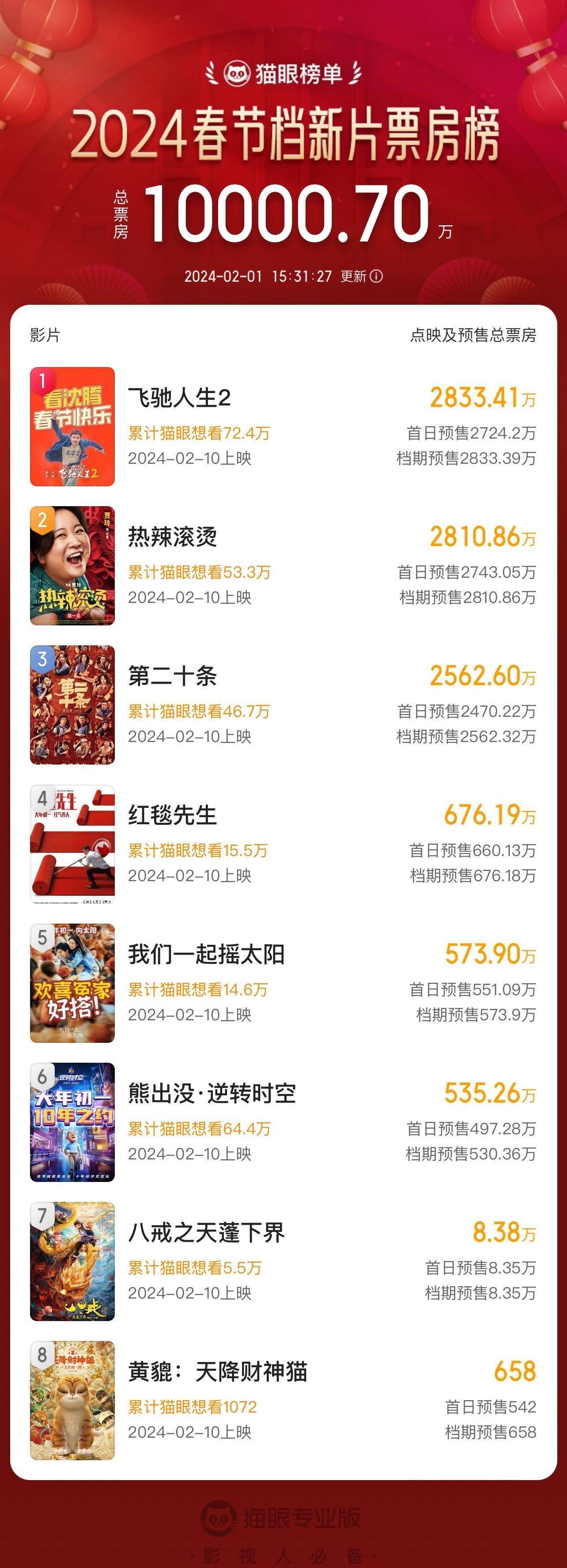 1905电影网讯据猫眼专业版数据,截至2024年2月1日15时31分,2024年春节档新片预售总票房突破1亿元!也是近三年(2022年以来)春节档新片预售票房破亿速度最快的一年。