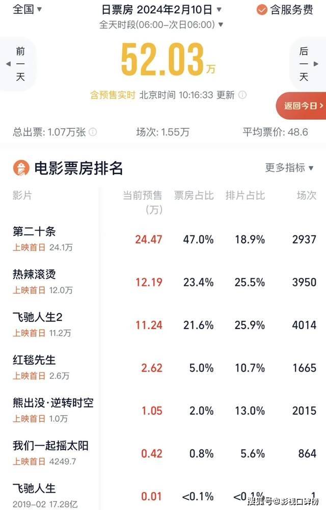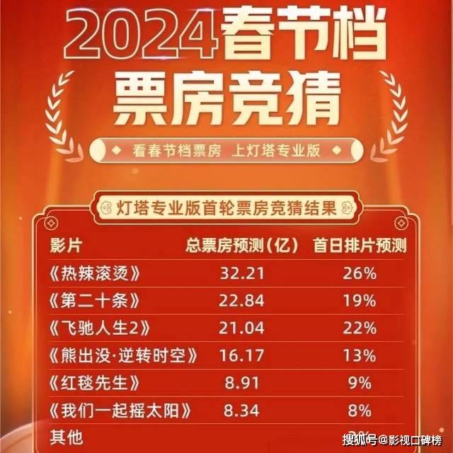 首先来看最专业的灯塔专业版给出的票房预测里面,位居榜首的《热辣滚烫》有32亿多;紧随其后的是张艺谋伟大家带来的喜剧《第二十条》,预测达到了22亿;再往下的是韩寒和沈腾的《飞驰人生2》,也能突破20亿的关口。至于被大家叫做是每年的春节守门员的《熊出没》,预测票房保持着稳定水平,有16亿;可能连10亿都突破不了,垫底的两位分别为《红毯先生》和彭昱畅主演的《我们一起摇太阳》。
