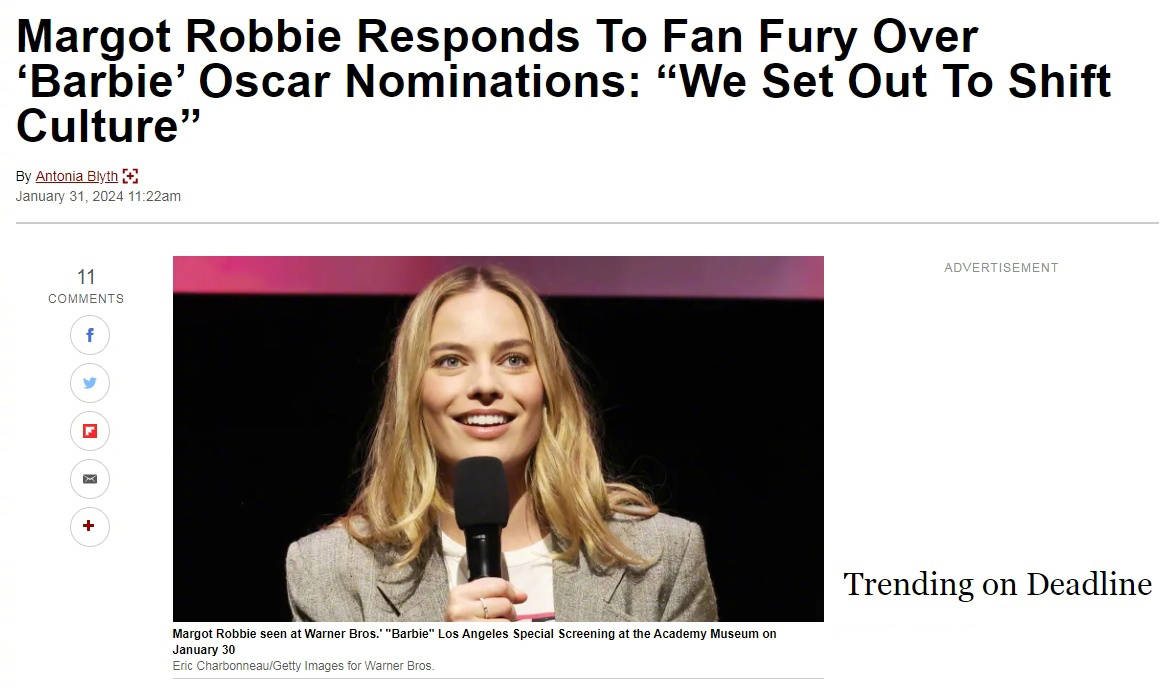 罗比表示:“你知道自己已如此幸运(获得八提)是不可能去悲痛的。很明显,我认为格蕾塔应该获得导演提名,她拿出的、做到的是职业生涯、一辈子千载难逢的表现,真的。但对所有电影来说这都是很棒的一年。”