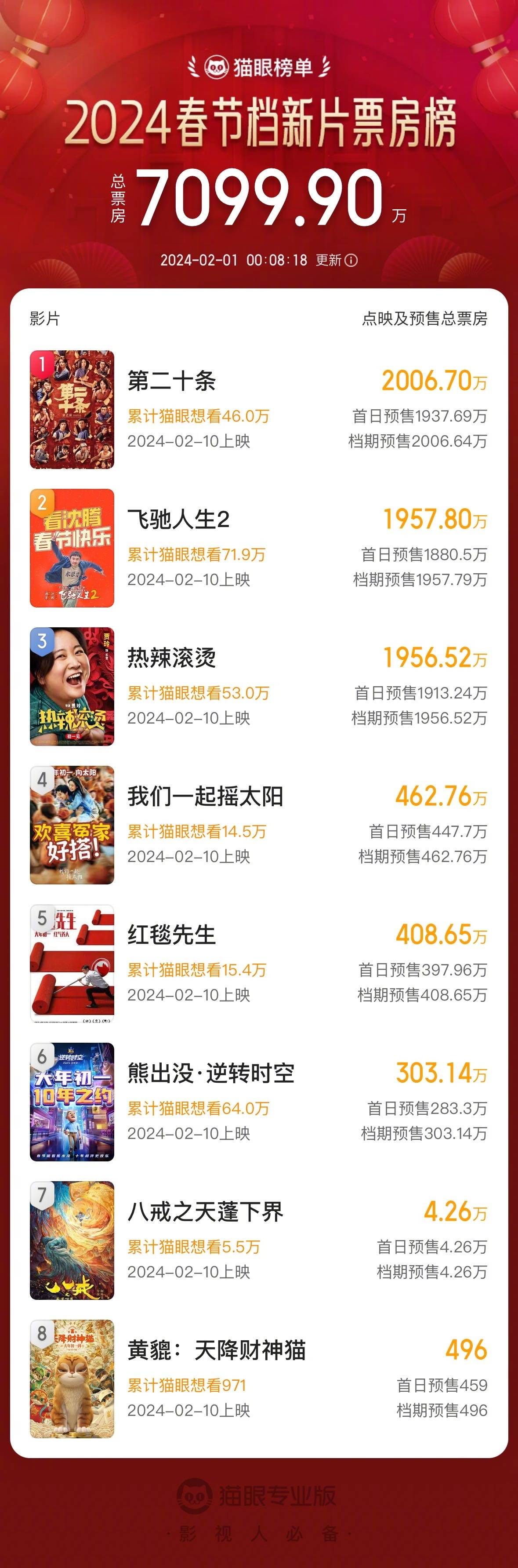 搜狐娱乐讯 据猫眼专业版数据,2024年春节档(2月10日-2月17日)于1月31日正式开启预售,截至1月31日24:00,预售首日票房达7099.9万。《第二十条》《飞驰人生2》《热辣滚烫》领跑预售票房榜前三。